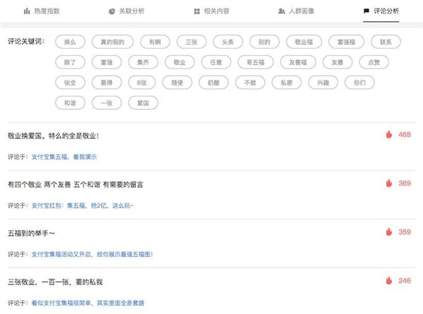 进入专题,会显示该话题的热度指数、事件分析、用户画像分析、评论等数据。