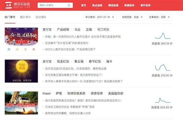 当“支付宝”话题开始成为热点的时候,会以热门事件展示,并显示相关热度值,对应的热度曲线为该事件在指定时间区间内的热度走势。