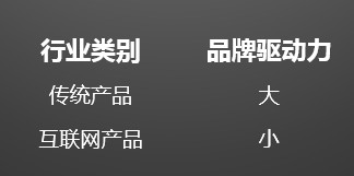 简单来说,互联网与传统行业的产品来对比,品牌驱动力变小。