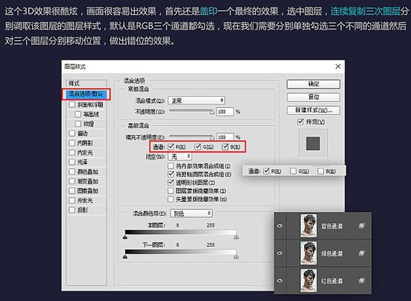 来源:站酷 作者:Susuvision 故障风格图片制作分为三个部分:首先是颜色错位,这一步比较容易,直接把做好的图片盖印,然后复制三层,每一层只需要设置一下图层样式中的混合选项,勾选一个通道,确定后用移动工具移动一点距离;然后是画面的局部错位,同样盖印图层后,用选区工具复制一些大小不均的部分,然后移动距离;最后是动感效果增加,用风滤镜及扭曲滤镜给图片局部或整体增加相应的效果。 最终效果 |