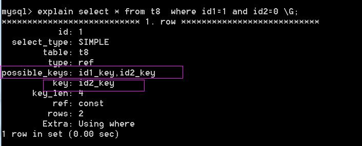 此时,在此执行select * from t8 where id1=1 and id2=0; 当然会考虑使用id1_id2_key索引。
