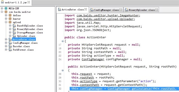3)在ConfigManager构造函数中传入了rootPath,初始指向应用的部署物理路径,依赖这个值在构造函数中去找到了ueditor的ueditor/jsp/config.json配置文件,接下来这个rootPath的用途就是文件上传的根路径了。接着看谁new了ConfigManager