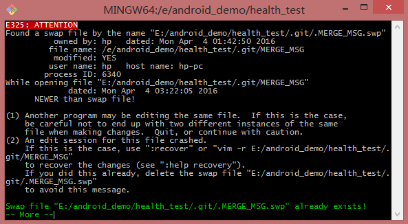 这个是让输入提交(commit)信息的,毕竟合并也是一次提交嘛,这个界面是vim编辑器,你要想在这里面输入信息,首先要将vim切换到编辑模式,按i键。输入完成之后输入":x"保存并退出。然后就合并完成了。
