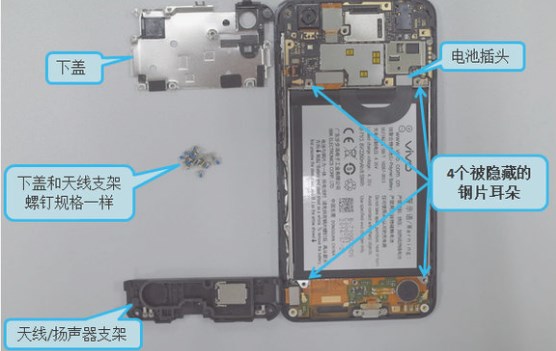 2.电池钢片其中4个耳朵隐藏的比较深,要拆电池必须先拆下盖和天线/扬声器支架,不然电池无法取下。